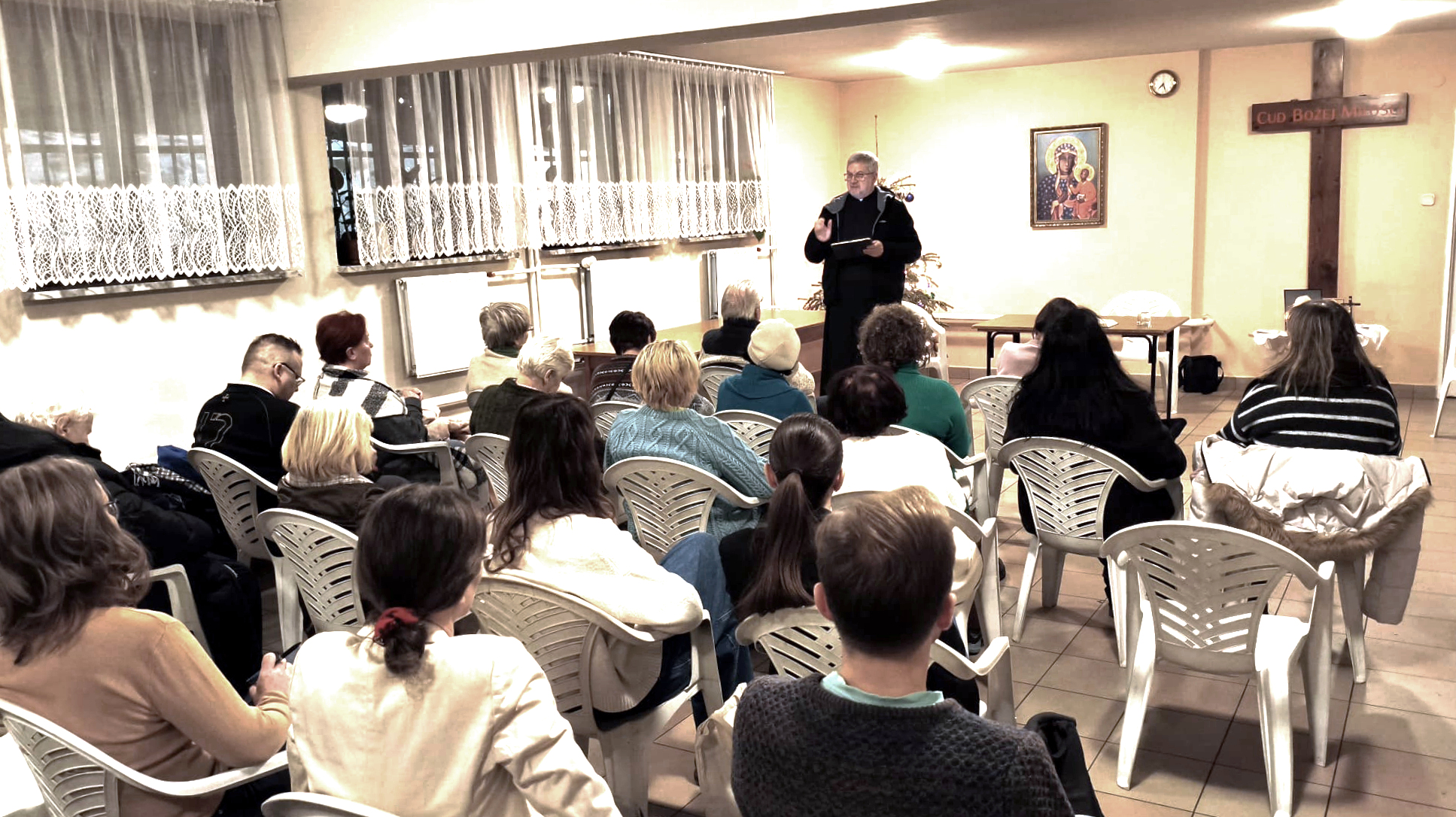 We wtorek 16 grudnia 2025 r. gościem Płońskiej Akademii ABC Chrześcijaństwa UO UKSW był ks. prof. Wojciech Kluj OMI, który wygłosił wykład poświęcony językowi modlitwy. Szczegółowym celem wykładu było przedstawienie różnorodności wersji językowych modlitwy „Zdrowaś Maryjo”. Nawet wersja łacińska „Ave Maria” jest już świadectwem kilku tłumaczeń, zaczynając od aramejskiego, przez grekę, z odniesieniami biblijnymi do tłumaczenia Septuaginty. Jako słowo pozdrowienia chrześcijanie Bliskiego Wschodu w wersjach modlitewnych przyjmują Pokój-Szalom. Tradycja prawosławna przyjęła „Ciesz się”, a tradycja zachodnia przyjęła „Bądź pozdrowiona”. Później w historii, w tradycji zachodniej powstała druga część „Święta Maryjo”. W tradycji tłumaczeń misyjnych tej modlitwy powstało wiele różnych, ciekawych pojęć. Nie wykluczają się one wzajemnie, ale ubogacają świadcząc o stałej żywotności tej modlitwy.